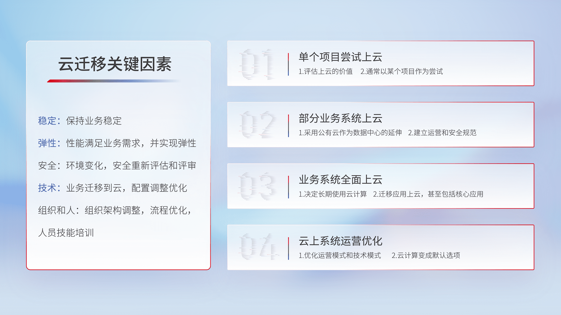 结合实际业务,,,从规划设计、、、、云平台选型、、云原生改造、、、、数据迁移、、、集成交付,,,,迁移全过程为客户识别最佳上云路径,,,,做好风险识别管理,,,,设计网络架构、、、、身份权限、、、安全审计合规、、、操作审计、、、日志审计、、监控告警策略、、、多站点容灾设计等,,,对云上基础设施进行整体规划,,提升IT治理水平,,,,以满足弹性、、高可用、、高性能的需求。。。。